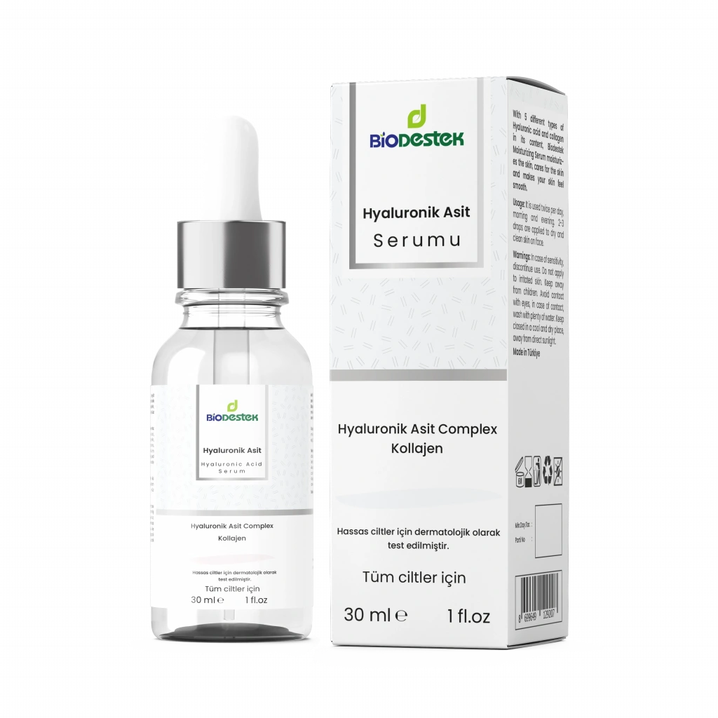 Biodestek Hyaluronik Asit Serum, İçeriğinde bulunan 5 farklı çeşit Hyaluronik asit ve kolajen ile cildi nemlendirir ve cilde bakım yapar. Hassas ciltler için dermatolojik olarak test edilmiştir.